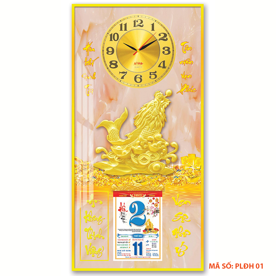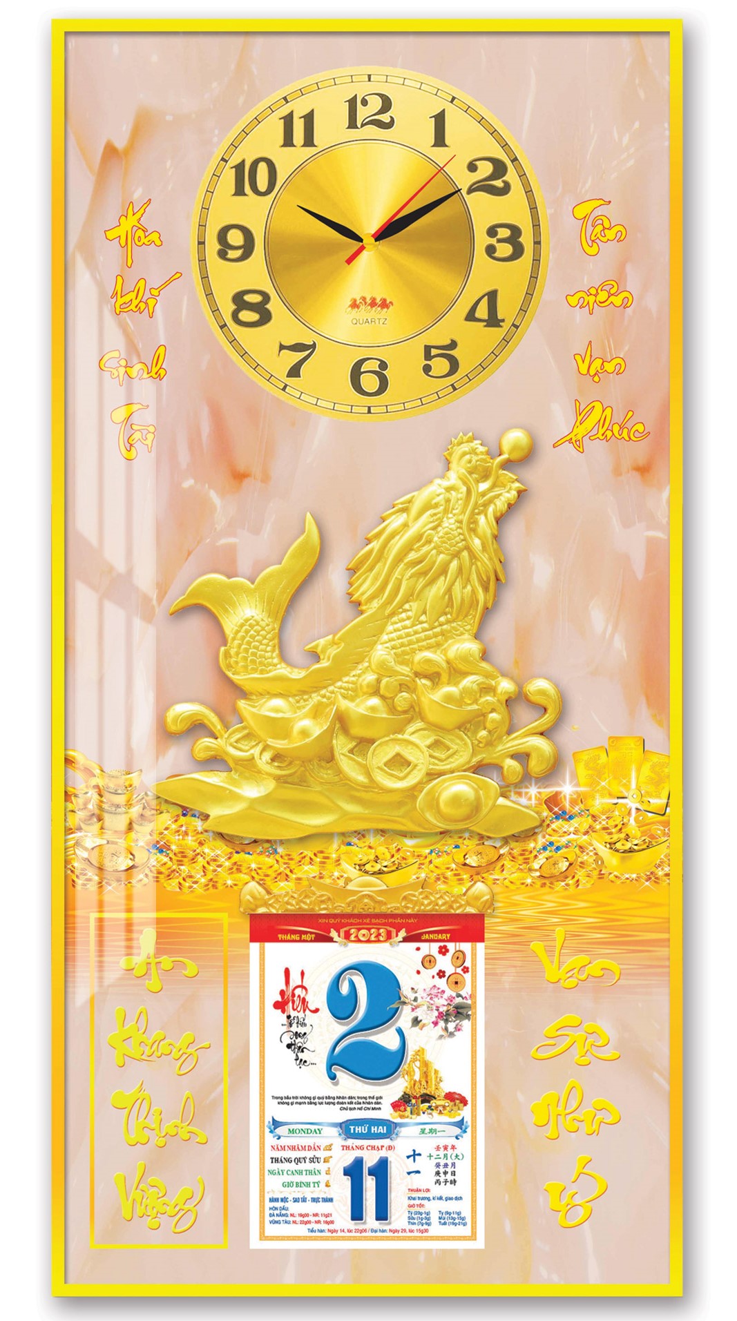 LỊCH KHUNG NỀN GỖ ĐẮP PHÙ ĐIÊU -CÁ CHÉP HÓA RỒNG.